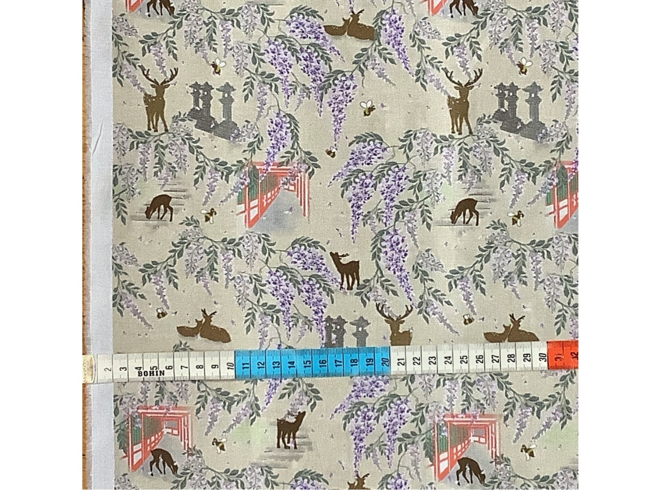 奈良の春日大社本殿へ向かう道中をイメージした、朱色の廻廊、鮮やかな藤の花と、鹿。