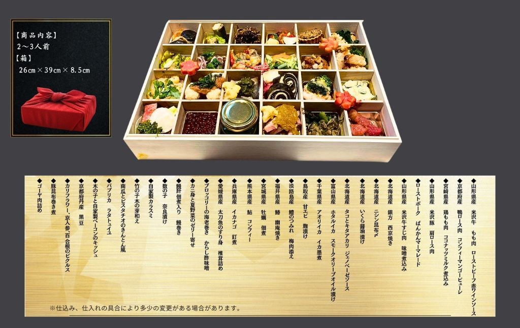 | 容量 | 【おせち】一段重 米沢牛 もも肉 ローストビーフ モロヘイヤソース 鴨ロース肉 コンフィー イチヂクソース 鶏もも肉煮込み ヨーグルトソース 米沢豚 肩ロース肉 チャコールグリル 柚子胡椒ジュレ 米沢牛すじ肉 味噌煮込み 大和肉鶏 砂肝 ハーブソテー 豚肉昆布巻き 豚軟骨チリコンカン ズッキーニ肉詰め 銀宝 西京焼き ニシン昆布〆 いくら醤油漬け 蛸わさ ホタルイカ スモーク オリーブオイル漬け 鱧のつみれ 梅肉添え 本マグロ グリル ハーブサルサ 鮑バター醤油 すだれ貝ぬた和え 子持ち鮎 コンフィー イカナゴ 釘煮 ブロッコリーの海老巻き からし酢味噌 カニ身と夏野菜のゼリー寄せ 鰻とナムルの玉子巻き 数の子 奈良漬け 自家製カラスミ 竹の子 木の芽和え 南瓜とピスタチオ きんとん風 海老芋ポテトサラダ パプリカ ラタトュイユ 京都府丹産 黒豆 カリフラワー、京人参、百合根のピクルス 【ズワイガニ鍋】 船凍生ズワイ蟹 |