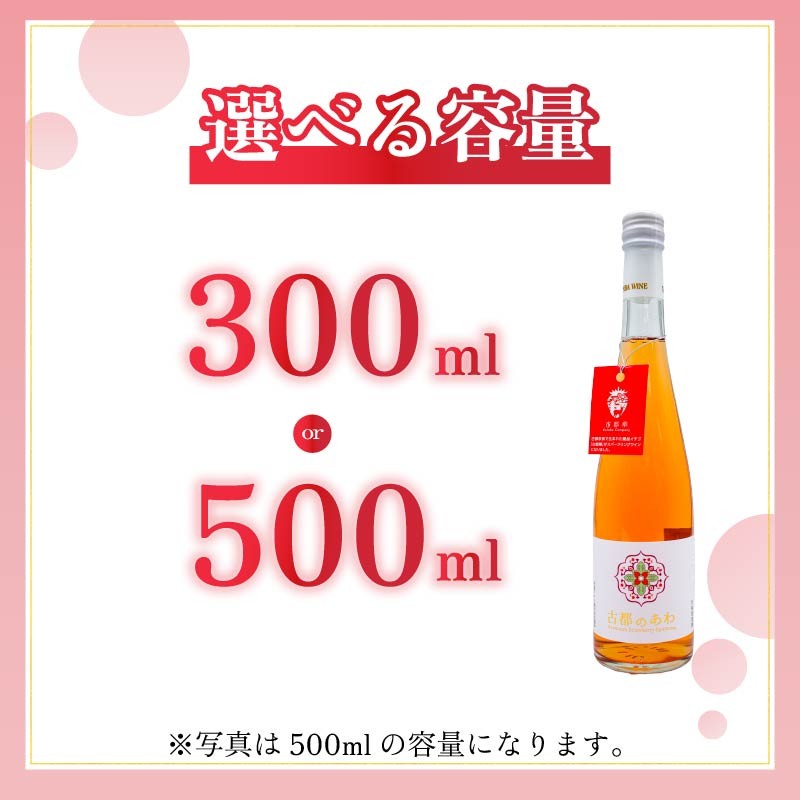 | 容量 | 奈良県産ブランドいちご古都華を100%使用 スパークリングワイン 古都のあわ アルコール度数:約11% ■300ml×1本 ■500ml×1本 |
