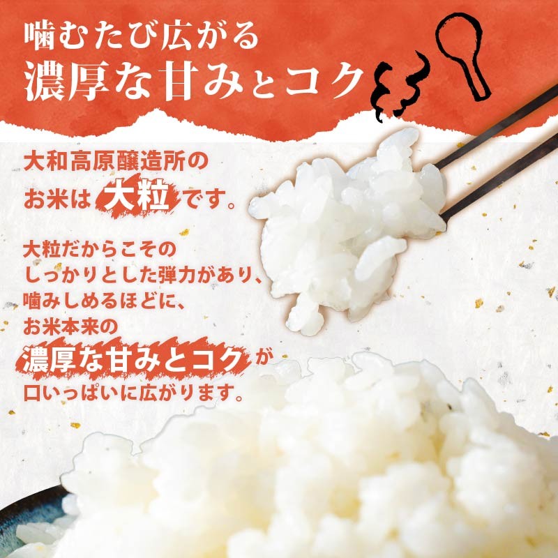 大和高原醸造所のお米は大粒です。大粒だからこそのしっかりとした弾力があり、噛みしめるほどに、お米本来の濃厚な甘みとコクが口いっぱいに広がります。