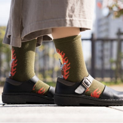 実際に履いてみると炎を踏んでいるように見え、サンダルなどの靴と合わせますと炎のデザインもちらりと見えて気分が上がります。