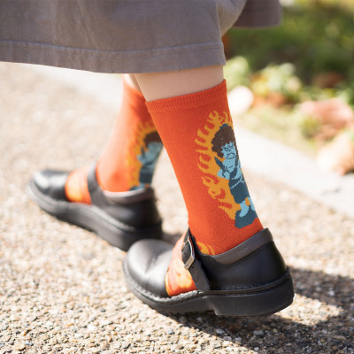 仏下-ぶつした-お不動ソックスは、かかとに不動明王、足裏に炎をデザインした靴下です。「お不動さん」と幅広い年代に親しまれる不動明王をより身近に、履いているだけでなんだか心強くなるような靴下が作りたくてデザインしました。怒りの表情をしていて見た目がちょっと怖いお不動さんですが童子の姿を元にマルっと可愛らしいデザインにしました。