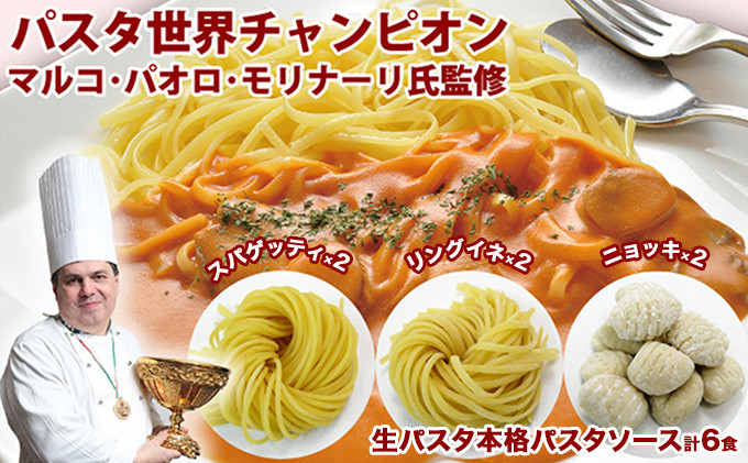 10年に1度のイタリア世界パスタコンクール3連覇のマルコ・パオロ・モリナーリ氏監修「パスタ世界チャンピオン」シリーズのセットです。生パスタは小麦の風味、もちもちとした食感が特徴。生パスタとソース各3種類の組み合わせをお楽しみいただけます。調理は手間いらず。生パスタをゆで、湯煎したソースを掛けるだけ。
