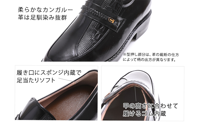 柔らかで足なじみ抜群のカンガルー革と、吸湿速乾のクールマックス素材を使用した中敷きで快適な履き心地。