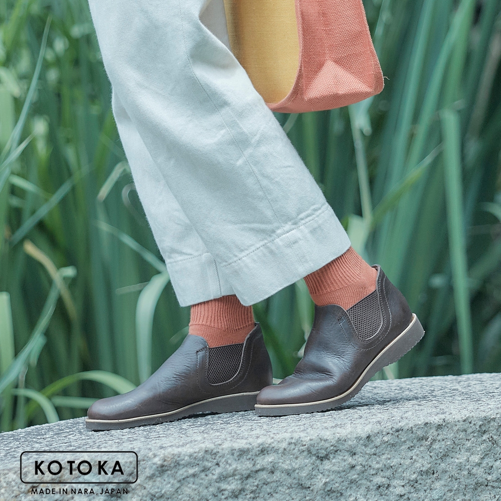 奈良県大和郡山市は日本有数の革靴の産地。この地で昔からひたむきに革靴作りに向き合ってきた靴メーカー7社が共同開発した革靴「KOTOKA」はシンプルで履きやすいデザインが特徴。甲革に鎌倉時代に遡る歴史を持つ日本最大の革の産地、兵庫県たつの市で、特に丁寧な加工で評価の高いタンナー「マルヒラ」で、植物タンニンで二次なめしされた革を使用。製造過程で通常2回使用するドラムを、なめし、染め、蝋引き、揉みの計4回使用し、手間をかけてつくられた革です。色ムラやシワが、履くほどに深味わいを醸し出します。古都ラインの靴はこの革の風合いを生かした、シンプルで履きやすく、飽きのこないデザインの靴です。