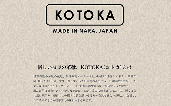奈良県大和郡山市は日本有数の革靴の産地。この地で昔からひたむきに革靴作りに向き合ってきた靴メーカー7社が共同開発した革靴「KOTOKA」はシンプルで履きやすいデザインが特徴。甲革に鎌倉時代に遡る歴史を持つ日本最大の革の産地、兵庫県たつの市で、特に丁寧な加工で評価の高いタンナー「マルヒラ」で、植物タンニンで二次なめしされた革を使用。製造過程で通常2回使用するドラムを、なめし、染め、蝋引き、揉みの計4回使用し、手間をかけてつくられた革です。色ムラやシワが、履くほどに深味わいを醸し出します。古都ラインの靴はこの革の風合いを生かした、シンプルで履きやすく、飽きのこないデザインの靴です。