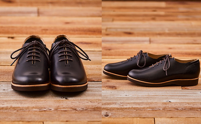 つま先からカカトまでを一枚の革でつくるホールカットタイプの靴。センターに長めに配した靴紐が個性的なデザインです。 厚手の、しかし柔らかなレザーを、敢えてライニング(裏張り)を使わず一枚革で使っています。このつくりが、革がやさしく足を包む履き心地の秘訣です。 ほどよく丸いつま先のラウンド木型を使用。カジュアルながら、洗練されたスタイルの靴に仕上がりました。