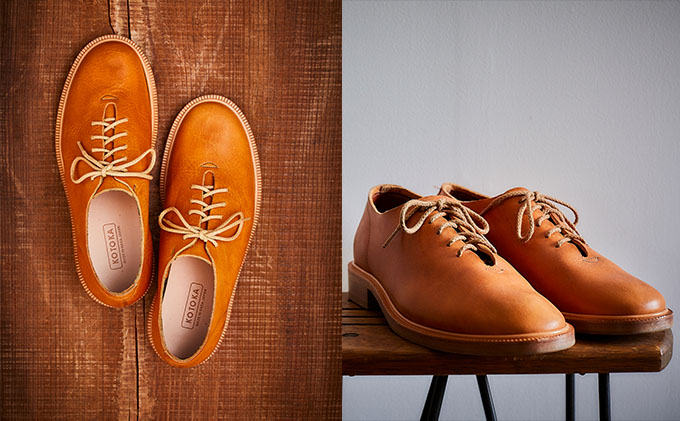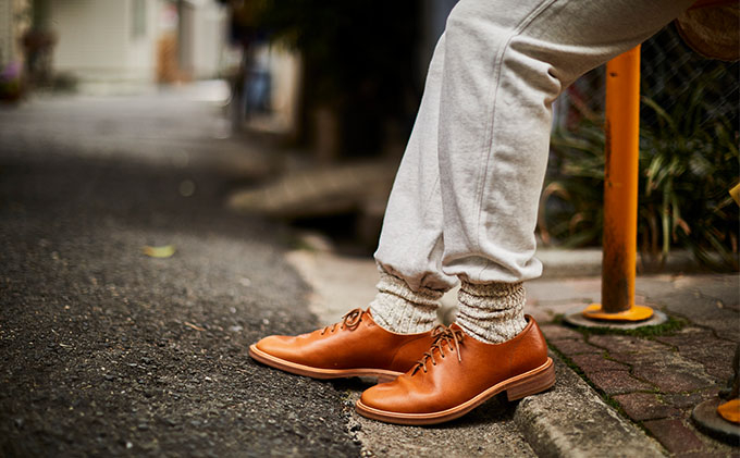つま先から踵までを一枚の革でつくるホールカットタイプの靴。 厚手ながら柔らかな栃木レザーを、敢えてライニング(裏張り)を使わず一枚革で使っています。この造りが、革が優しく足を包む履き心地の秘訣です。 程よく丸いつま先のラウンド木型を使用。カジュアル且つ洗練されたスタイルの靴に仕上げました。