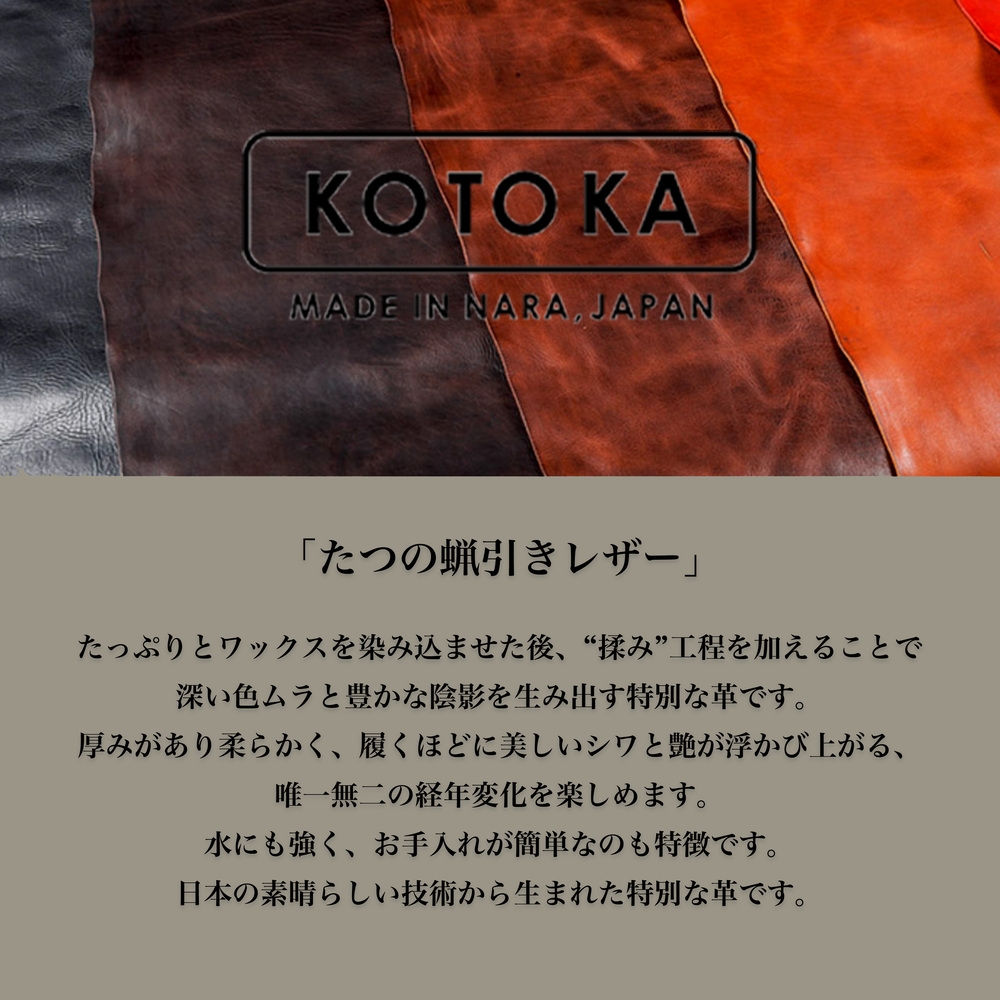 奈良県大和郡山市は日本有数の革靴の産地。この地で昔からひたむきに革靴作りに向き合ってきた靴メーカー7社が共同開発した革靴「KOTOKA」はシンプルで履きやすいデザインが特徴。甲革には鎌倉時代に遡る歴史を持つ日本最大の革の産地、兵庫県たつの市の中で、特に丁寧な加工で評価の高いタンナー「マルヒラ」で、植物タンニンで二次なめしされた革を使用。製造過程で通常2回使用するドラムを、『なめし、染め、蝋引き、揉み』の計4回使用し、手間をかけてつくられた革です。色ムラやシワが、履くほどに深い味わいを醸し出します。古都ラインの靴はこの革の風合いを生かした、シンプルで履きやすく、飽きのこないデザインの靴です。