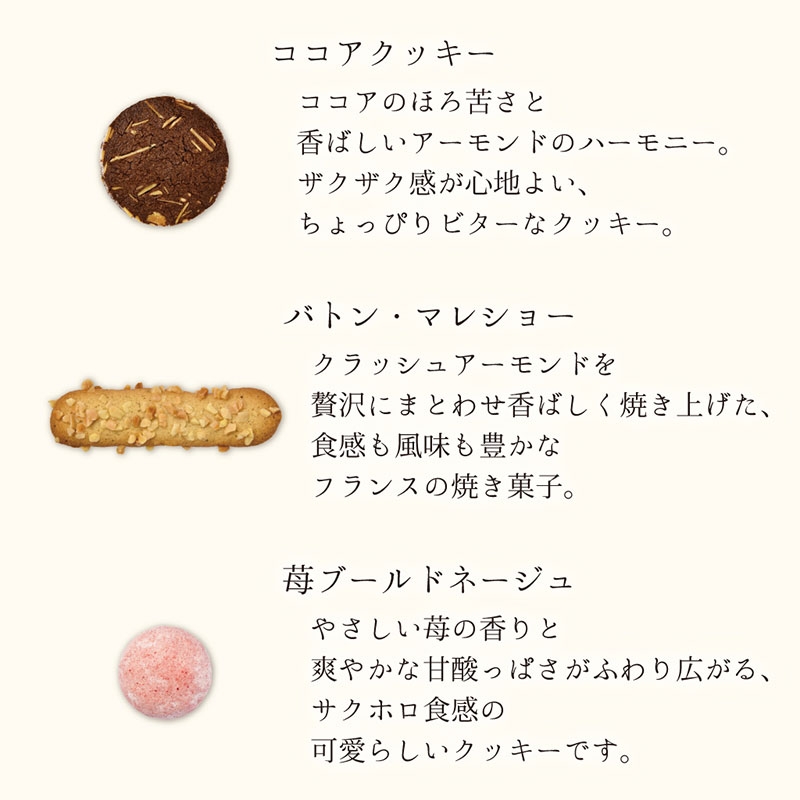 | 容量 | 内容量 おいもサブレ4枚 チーズクッキー8枚 塩サブレ3枚 ココアクッキー3個 バトンマレショー4枚 苺スノーボール2個 和紅茶クッキー3枚 ナッツクッキー2枚 レモンムラング6g 原材料名 おいもサブレ(バター(国産),小麦粉,砂糖,紫芋粉,生クリーム(乳成分を含む),アーモンドパウダー,卵白(卵を含む),天然塩), チーズクッキー(小麦粉(国産),バター,パルメザンチーズ,卵白(卵を含む),生クリーム(乳成分を含む),砂糖,卵黄,天然塩), 塩サブレ(小麦粉(国産),バター,砂糖,卵黄(卵を含む),天然塩), ココアクッキ-(砂糖(国内製造),小麦粉,バター,アーモンドスライス,アーモンドプードル,ココアパウダー,卵黄(卵を含む)), バトンマレショー(砂糖(国内製造),卵白(卵を含む),アーモンドダイス,バター,アーモンドプードル,小麦粉,バニラペースト), 苺スノーボール(小麦粉(国産),砂糖,バター,アーモンドプードル,アーモンドダイス,米油,脱脂粉乳,苺パウダー), 和紅茶クッキー(小麦粉(国産),バター,砂糖,アーモンドプードル,卵黄(卵を含む),和紅茶), ナッツクッキー(小麦粉(国産),バター,マカダミアナッツ,砂糖,アーモンドダイス,卵白(卵を含む),卵黄,コアントロー(オレンジを含む)), レモンムラング(砂糖(国内製造),卵白(卵を含む),レモン果汁) |