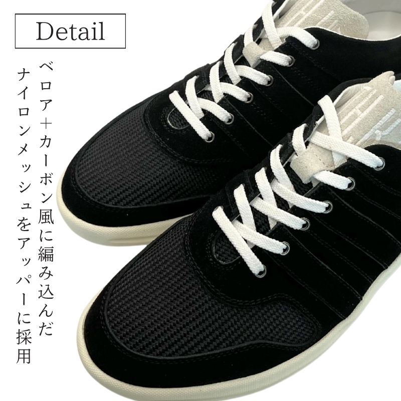 アッパーには、ベロア+カーボン風に編み込んだナイロンメッシュを採用し、ライニングには通気性・弾力性に優れたナイロンメッシュ、甲回りにはスニーカーの部類としては贅沢なピッグレザーを全体に使用しています。ソールのグリップ性能は、スタッドレスタイヤの形状を利用している為、雨の日には滑りにくくなっています。