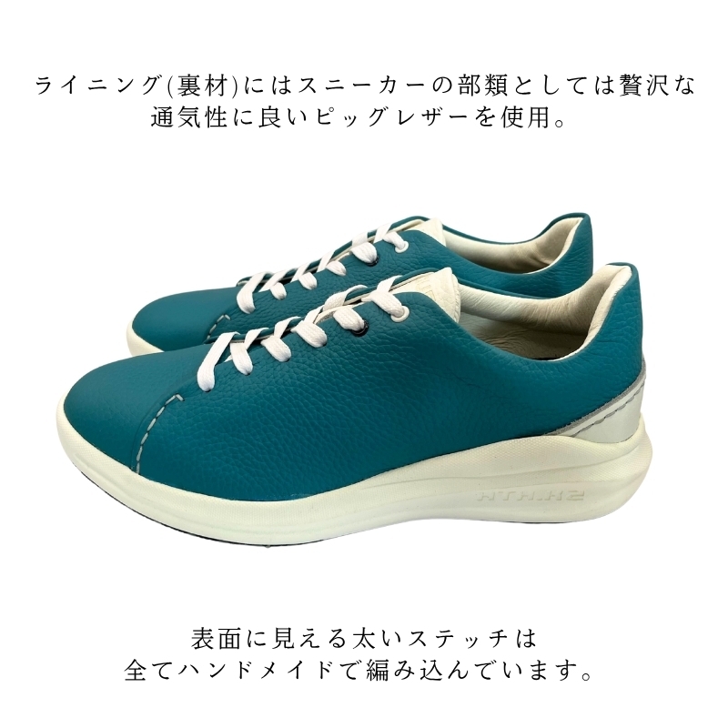 アッパーには、ソフトシュリンクレザーを採用し、ライニングにはスニーカーの部類としては贅沢なピッグレザー(通気性に良い)を全体に使用しています。表面に見える太いステッチは全てハンドメイドで編み込んでいます。ソールのグリップ性能は、スタッドレスタイヤの形状を利用している為、雨の日には滑りにくくなっています*1。また、カップインソールにおいては、従来のEVAスポンジからウレタンスポンジを使用することによりクッション性能の持続力がUPされ着地時の衝撃を吸収します。1歩行状況によっては、まったく滑らないということではありません。個人差がございますので歩行には十分にご注意下さい。
