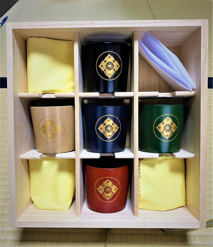 桐でできた化粧箱の仕切りは日本最初の都である藤原京の4条~5条の条理に位置する今井町の町並みを表し、マグカップの配置は紫色を太極殿に見立てて中央に据え、四神(玄武、白虎、朱雀、青龍)で囲むように箱に詰めました。