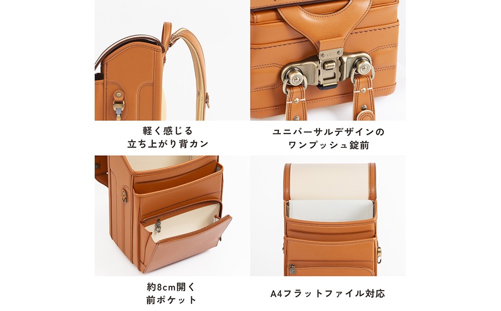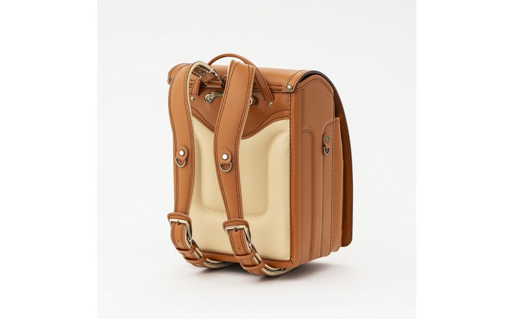 スッキリとした見た目のキューブ型ランドセル。牛革でのキューブ型は技術的に難しく、つくり手のこだわりを感じさせます。前締めベルトをなくし、かぶせ(ふた)のカシメとポケットに重厚感のあるブロンズ調金具を採用することで、より大人っぽく落ち着いたデザインに仕上がりました。