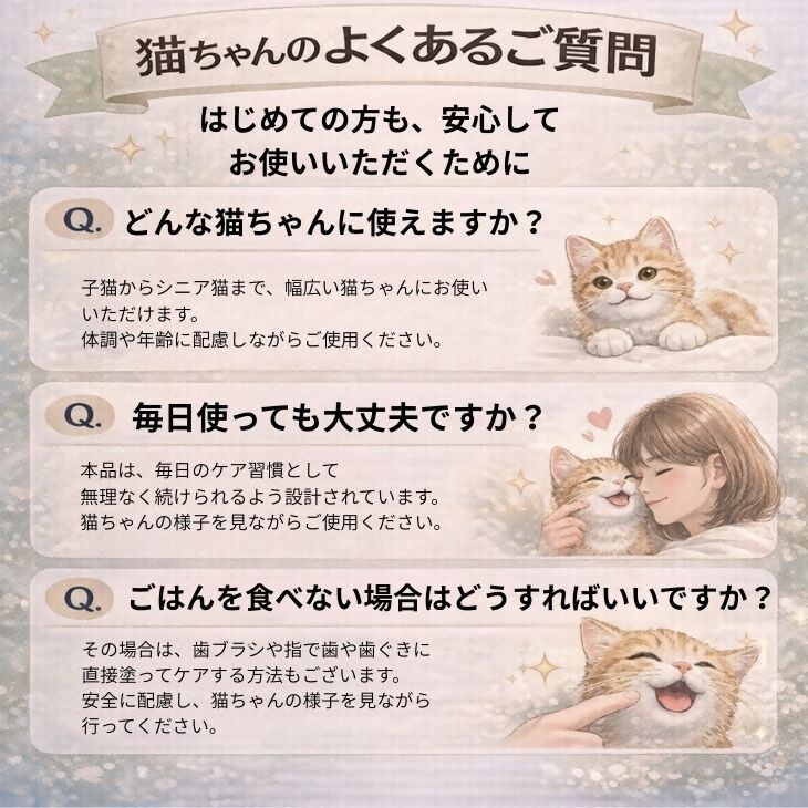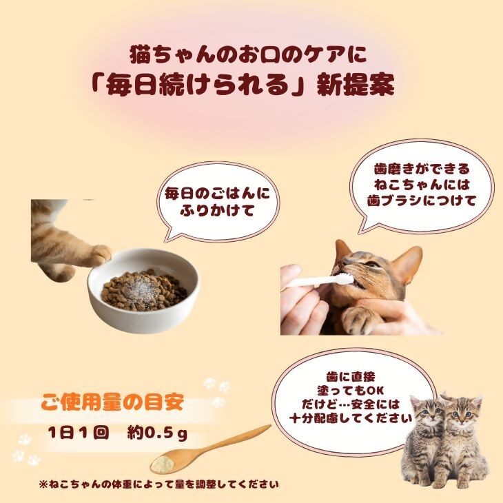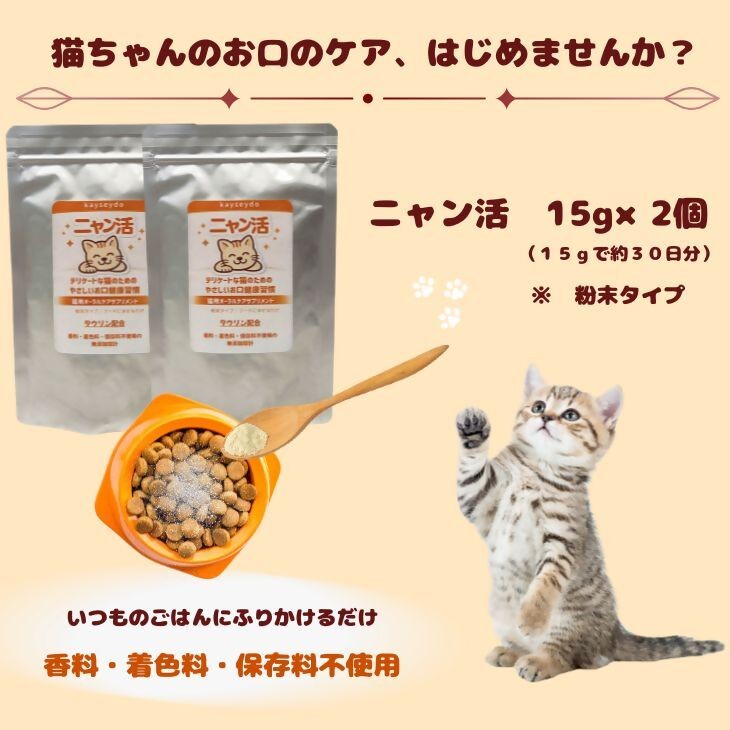 ペット用オーラルケアサプリメント「ニャン活」は、愛猫のお口の健康をサポートする、毎日のケアを目的としたペット用健康補助食品です。