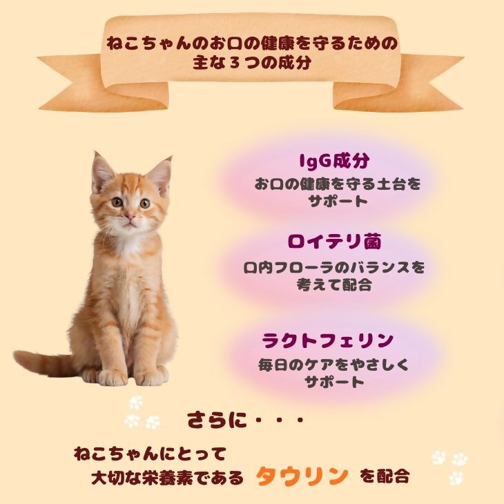 IgG成分、ラクトフェリン、ロイテリ菌・のW乳酸菌に加え、ねこちゃんにとって大切な栄養素であるタウリンを配合。ねこちゃんの健康を考えたバランスで設計されています。