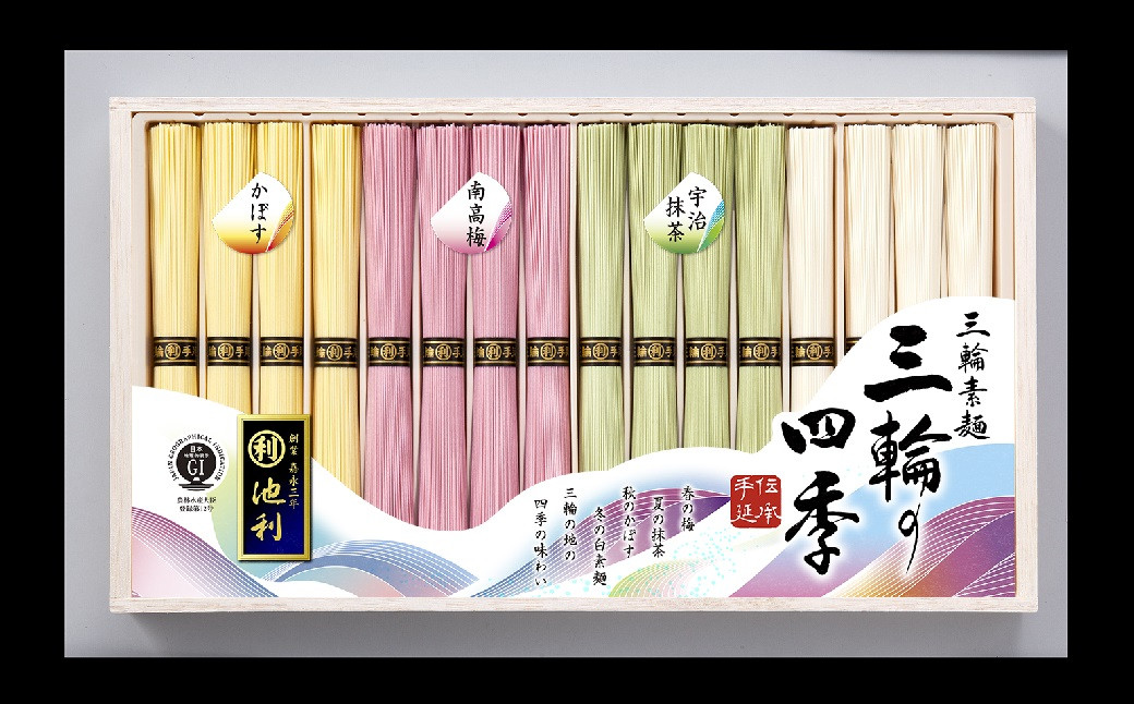 しっかりした独特のコシはそのままに、梅・宇治抹茶・かぼすの風味と色彩を備えた手延べ三輪そうめんです。