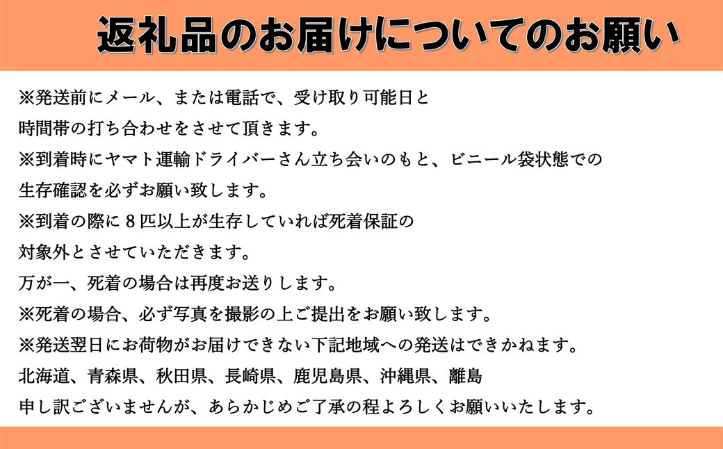 到着時にヤマト運輸ドライバーさん立ち会いのもと、ビニール袋状態での生存確認をお願い致します。