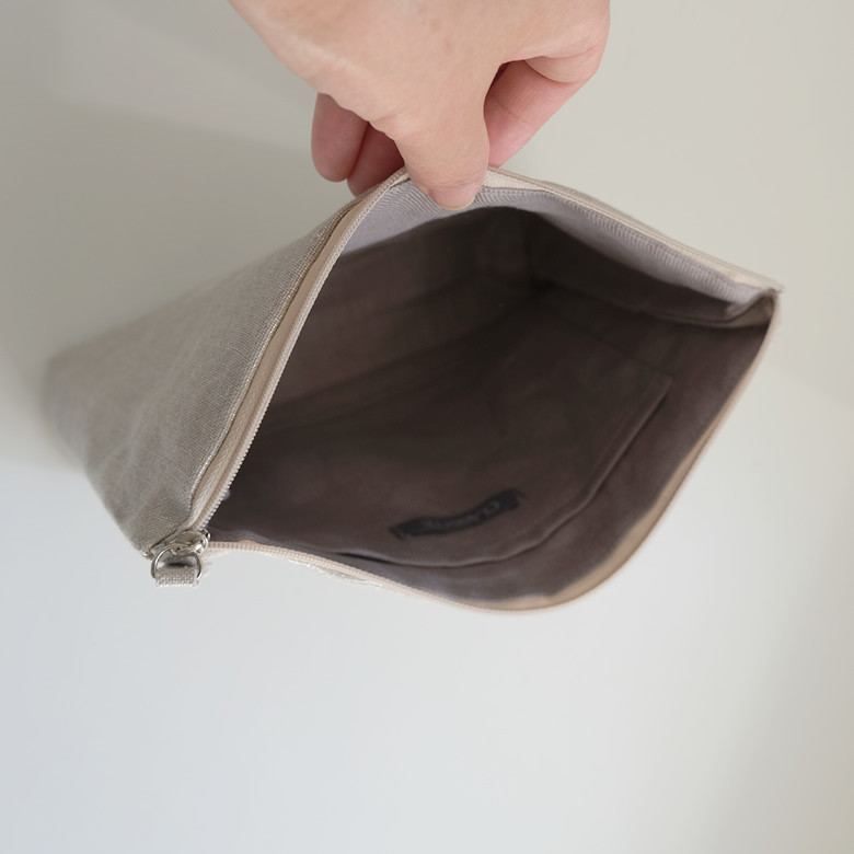 内側には、同系色のリネンの裏地を使用しております。小さなアクセサリーなどを入れておくのに便利なオープンポケットが付いています。