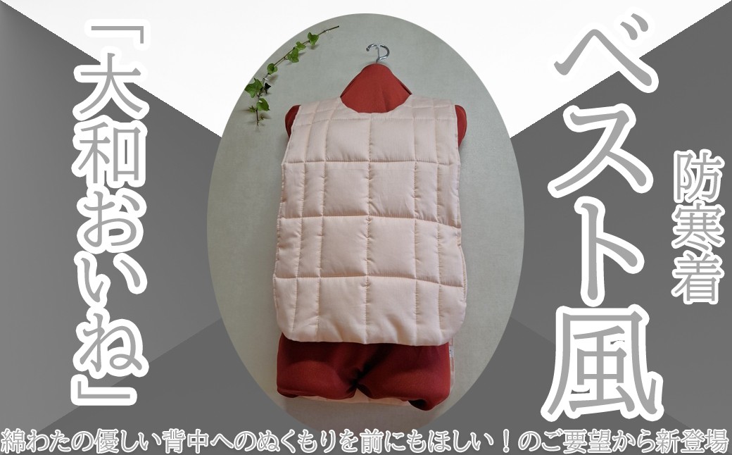 綿わたのやさしい温もりで、背中から前側、肩先まで包み込む防寒ベストです。 BH-8.【ベストな防寒着】大和おいね ベスト風防寒着
