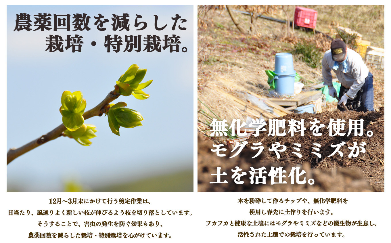 木を粉砕したチップを使い、春先から土壌を整え、モグラやミミズ、微生物が息づく豊かな環境を守り続けています。本当に美味しい返礼品を届けたいという思いでお届けしています。