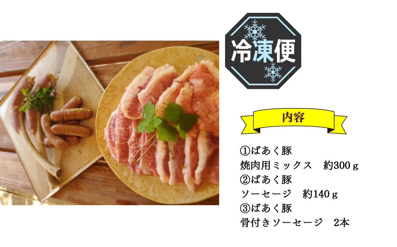 | 容量 | 1.ばあく豚 焼肉用ミックス 約300g 2.ばあく豚 ソーセージ 約140g 3.ばあく豚 骨付きソーセージ 2本 【原材料】 1.《焼肉用豚肉》:豚肉 2.《ソーセージ》:豚肉、食塩、生姜、玉ねぎ、ニンニク、コーンスターチ、香辛料、羊腸 3.《骨付きソーセージ》:豚肉、食塩、生姜、玉ねぎ、ニンニク、コーンスターチ、香辛料、豚腸 保存方法:要冷凍(-18℃以下) |