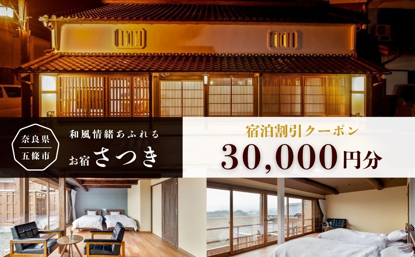 自然豊かな五條新町にある貸別荘に泊まってみませんか? お宿さつき 割引電子クーポン 30,000円分 | 旅行 クーポン 宿泊券 トラベル チケット 人気 観光 おすすめ 食べる 泊まる 観光 温泉 ホテル 旅館 ギフト 金券 近畿 利用券 国内旅行 奈良県 五條市