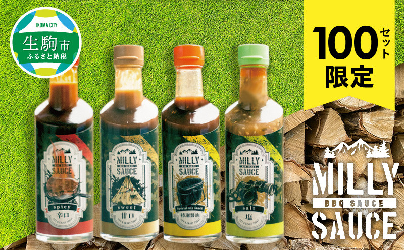 かっこよくアウトドアで使える4つの味!!! 【アウトドア専用ソース!?】MILLY SAUCE(100セット限定) 100セット限定 焼肉のたれ 360g 4種 セット MILLY SAUCE 辛口 甘口 特注しょうゆ 梅ソルトハーブソース アウトドア 専用 ホルダー 持ち運び たれご飯 カレー お好み焼き たれ 隠し味 お取り寄せ 送料無料