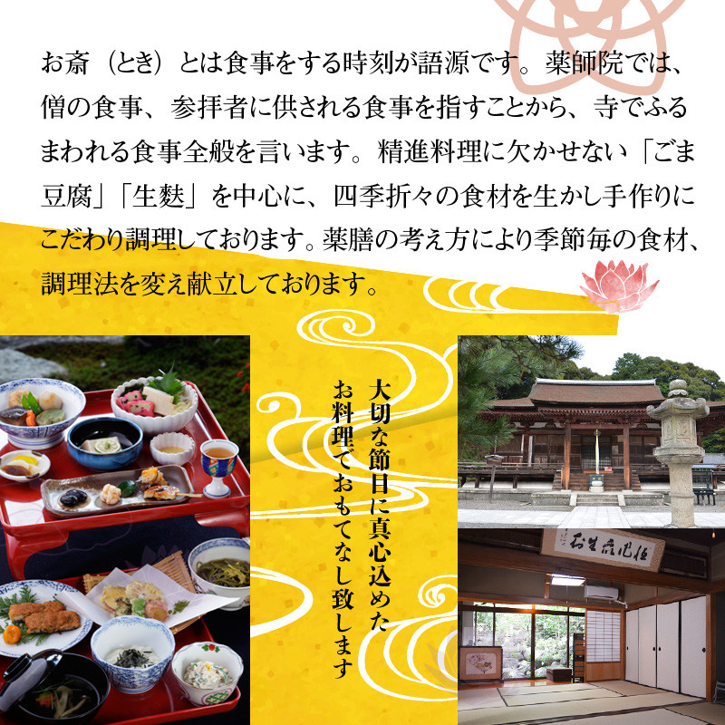 お斎(とき)とは食事をする時刻が語源です。薬師院では、僧の食事、参拝者に供される食事を指すことから、寺でふるまわれる食事全般を言います。精進料理に欠かせない「ごま豆腐」「生麩」を中心に、四季折々の食材を生かし手作りにこだわり調理しております。薬膳の考え方により季節毎の食材、調理法を変え献立しております。商品画像はサンプルです。お盆・年末年始は予約不可。