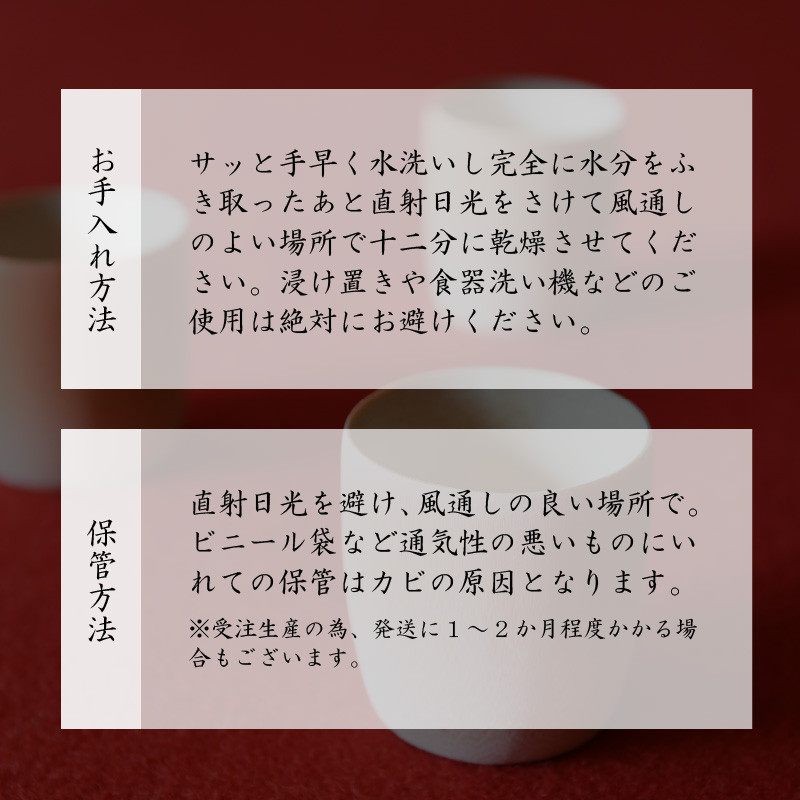 サッと手早く水洗いし完全に水分をふき取ったあと直射日光をさけて風通しのよい場所で十二分に乾燥させてください。浸け置きや食器洗い機などのご使用は絶対にお避けください。