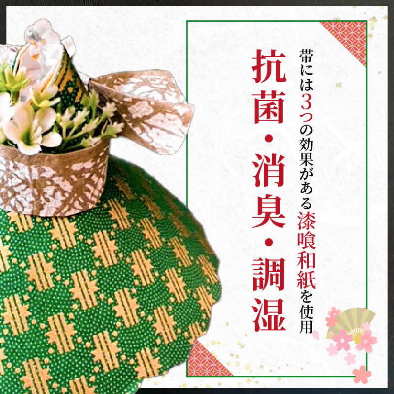 食卓を明るく楽しくできるカップカバーとして帯には抗菌・消臭・調湿効果のある漆喰和紙を使用しています。