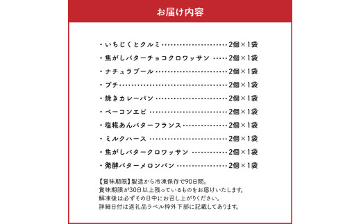 容量 | 規格・内容量(色・サイズ等の展開がある場合は併せて記載) 10種20個入り 【いちじくとクルミ】2個×1袋 【焦がしバターチョコクロワッサン】2個×1袋 【ナチュラブール】2個×1袋 【プチ】2個×1袋 【焼きカレーパン】2個×1袋 【ベーコンエピ】2個×1袋 【塩糀あんバターフランス】2個×1袋 【ミルクハース】2個×1袋 【焦がしバタークロワッサン】2個×1袋 【発酵バターメロンパン】2個×1袋 |