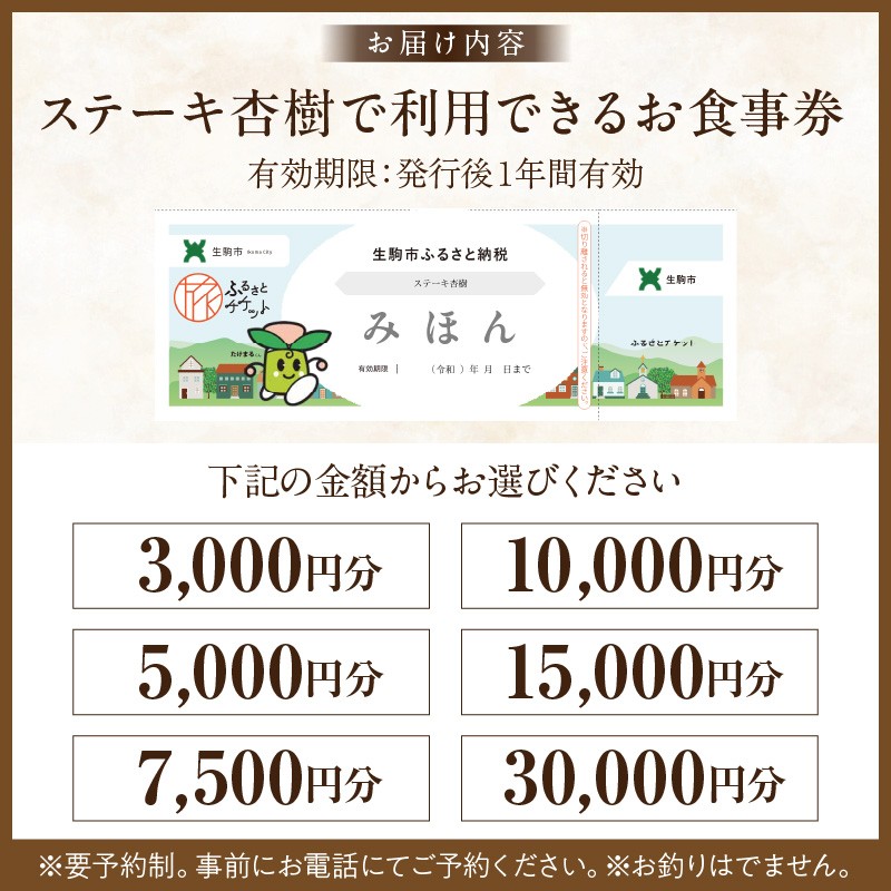 | 容量 | 下記よりお選びください。 ・お食事券【3,000 円分】 ・お食事券【5,000 円分】 ・お食事券【7,500 円分】 ・お食事券【10,000 円分】 ・お食事券【15,000 円分】 ・お食事券【30,000 円分】 ※お釣りはでません。 ■ランチメニュー■ 特選ステーキコース3500円 ハーフサイズコース2500円 ハンバーグステーキコース2500円 etc ■ディナーメニュー■ 特選ステーキコース3600円 etc (日によってコース内容は変わります) 要予約制。事前にお電話にてご予約くださいませ。 |
