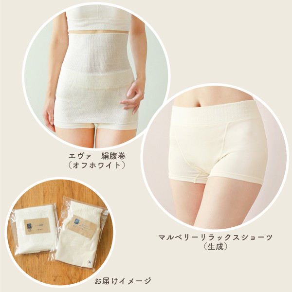 | 容量 | 腹巻1枚・ショーツ1枚 ■エヴァ絹腹巻 【サイズ】 フリーサイズ/丈36.5cm×周囲50cm(最大伸び178cm) 【カラー】 オフホワイト 【素材】 絹91% ナイロン8% ポリウレタン1% ※肌に絹が当たるよう編み上げています。 ■マルベリーリラックスショーツ 【サイズ】 M/ウエスト周囲41cm(最大伸び140cm)・ヒップ周囲60cm(最大伸び150cm) 【カラー】 生成 【素材】 絹90%、ナイロン9%、ポリウレタン1% ※肌側は絹100%になるよう編み上げています。 ウエスト部:コットン80%、絹20% ※混紡糸を使用。 ※編みこみ伸縮糸には、コットンCSYを使用しています。 ※各1点ずつOPP袋にて梱包してお届けします。 【洗濯方法】 中性洗剤で手洗い、風通しの良い所で陰干し |