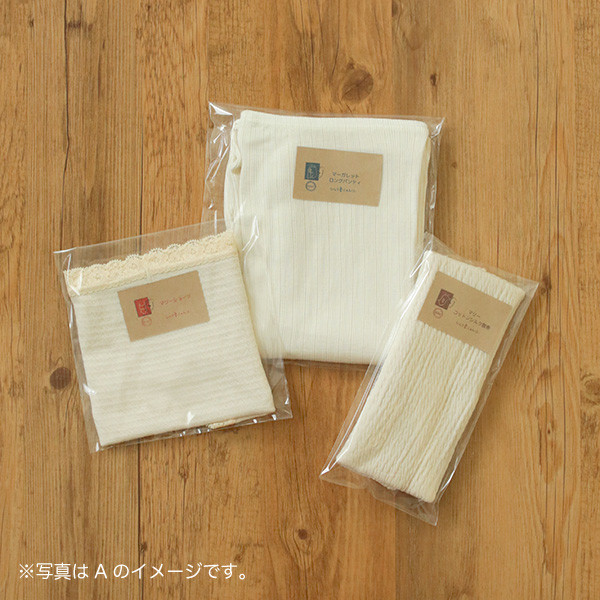 「マリーショーツ」「マリーコットンシルク腹巻」「マーガレットロングパンティ」各1枚ずつのセット。