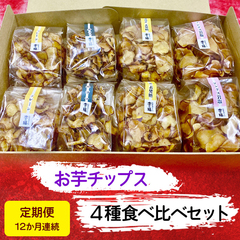 12ヶ月間毎月、お芋チップス箱入り (4種2個) をお送りします。