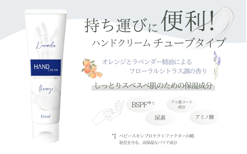 「サラッ」としたつけ心地と、 しっとり感が長持ち。スリムで持ち運びに便利なチューブタイプ♪ 蓋をなくさないワンタッチキャップ。 ラベンダー油とオレンジ果皮油による落ち着いたフローラルシトラス調の香りです。 しっとりスベスベ肌のための保湿成分(BSPF®*1、フッ素コート成分*2、尿素、アミノ酸*3)配合。 自然に手指になじんで、手アレをしっかり整えます。 翌朝はしっとり透明感のある手肌に。 「サラッ」としたつけ心地なのに、しっとり感が長持ちします。 乾燥のひどい「ひじ」や「かかと」にもご利用ください。 ※ジャータイプとチューブタイプは、香料のみが異なり、他の内容成分は同じです。 *1 分岐脂肪酸(C12-31)コレステリル:胎児の皮膚を外界の刺激から保護する成分で非常に優れた保湿力があります。 *2 ポリパーフルオロメチルイソプロピルエーテル *3 セリン 提供:ゲオール化粧品 HP:https://www.geol.co.jp 【ご注意ください】 ・不備に関する返品等のご対応は、受取から日にちが経過すると対応出来ない場合がございます。お受け取り後はお早めにお礼品の状態をご確認いただきますようお願い申し上げます。 ・発送後、運送業者の保管期限内にお受け取りいただけない場合は、運送業者のルール上、やむを得ず当方へ返送されます。その場合、再発送の対応は出来かねます。 ・お礼品発送後にお届け先を変更する場合、転送料金は受取人様の負担(着払い)になります。 【キャンセル等について】 ふるさと納税は「寄附」となりますので、寄附のお申込み手続きが完了した後にキャンセルすることはできません。 重複でのお申込みやご名義に誤りなどがないようご注意ください。 ※寄附お申込み前に上記をあらかじめご了承ください。
