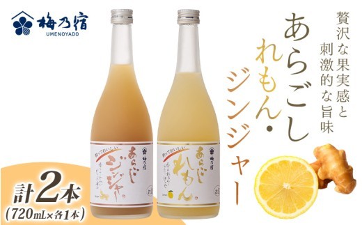 割って楽しむ人気のリキュールをセットにしました! <あらごしれもん> 「あらごしれもん」 は国産レモンを使用。 自社製造のレモン浸漬酒、レモンクラッシュ、国産蜂蜜を加えることで、本格的な香りとコクのある甘さを実現しました。 寒い日はホットでお湯割り、暑い日はサワーやビール割りでお楽しみください! 【お勧めの割り方】 あらごしれもん1:炭酸水2 あらごしれもん1:お湯1 あらごしれもん1:ビール2 あらごしれもん1:紅茶2 アルコール度数 10度 <あらごしジンジャー> しょうがの刺激的な旨みが際立つ本格ジンジャーリキュール。 国産のすりおろししょうがを使用し、しょうがそのものの自然な辛味、爽やかな香り、奥深い風味を引き出しています。 また、甜菜糖を使用することで、優しい甘さが上品なコクを引き立たせています。 スパイシーなリキュールですので、エスニック料理とのペアリングも抜群! しょうが好きにはたまらない… ジンジャーすりおろしがたっぷりです。 【お勧めの割り方】 あらごしジンジャー1:炭酸水3 あらごしジンジャー1:ビール3 あらごしジンジャー1:お湯2 アルコール度数 15度 【原材料】 あらごしれもん:レモン、レモン浸漬酒(国内製造)、日本酒、スピリッツ、糖類、はちみつ/クエン酸 あらごしジンジャー:しょうが、スピリッツ、日本酒、高果糖液糖(国内製造)/クエン酸、ビタミンC ※2024年9月より原材料の一部が順次変更となります。(醸造アルコール→スピリッツ) 提供:梅乃宿酒造株式会社 【ご注意ください】 ・不備に関する返品等のご対応は、受取から日にちが経過すると対応出来ない場合がございます。お受け取り後はお早めにお礼品の状態をご確認いただきますようお願い申し上げます。 ・発送後、運送業者の保管期限内にお受け取りいただけない場合は、運送業者のルール上、やむを得ず当方へ返送されます。その場合、再発送の対応は出来かねます。 ・お礼品発送後にお届け先を変更する場合、転送料金は受取人様の負担(着払い)になります。