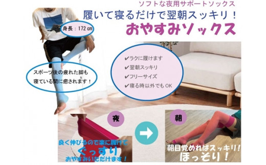 おやすみソックスは、寝ている間に足の疲れを効果的にケアし、朝にはむくみをスッキリ解消する優れた商品です。 その秘密は、膝上までのロングタイプで足全体を包み込むことで、優しくマッサージ効果が得られることです。 このソックスは、ソフトな着圧感が特徴であり、長時間の使用でも快適さを保ちます。 着用すると、緩んだ筋肉や血液循環をサポートし、目覚めた時には足が軽く感じられることでしょう。 朝の目覚めが爽やかで、一日中快適に過ごすことができます。 さらに、おやすみソックスの利用シーンは様々です。 寝る前に履いて疲れた足を癒やすだけでなく、デスクワークや長時間の立ち仕事で疲れた足を休めるのにも最適です。 旅行やフライト中でもむくみを予防し、快適な足元を保つことができます。 2足セットなので、毎日でも履いて頂けます。 <取り扱い注意事項> - 洗濯の際は、洗濯ネットを使用し、手洗いもしくは弱い洗濯モードで洗濯してください。 - ドライクリーニングはお避けください。 - 直射日光や高温の場所での保管は避け、風通しの良い場所で保管してください。 おやすみソックスは、理想的な睡眠と疲れ知らずの足元を叶える頼もしいパートナーです。是非、ご自宅やオフィスでの快適な時間をお楽しみください。 提供:RunNext 【ご注意ください】 ・不備に関する返品等のご対応は、受取から日にちが経過すると対応出来ない場合がございます。お受け取り後はお早めにお礼品の状態をご確認いただきますようお願い申し上げます。 ・発送後、運送業者の保管期限内にお受け取りいただけない場合は、運送業者のルール上、やむを得ず当方へ返送されます。その場合、再発送の対応は出来かねます。 ・お礼品発送後にお届け先を変更する場合、転送料金は受取人様の負担(着払い)になります。 【キャンセル等について】 ふるさと納税は「寄附」となりますので、寄附のお申込み手続きが完了した後にキャンセルすることはできません。 重複でのお申込みやご名義に誤りなどがないようご注意ください。 ※寄附お申込み前に上記をあらかじめご了承ください。