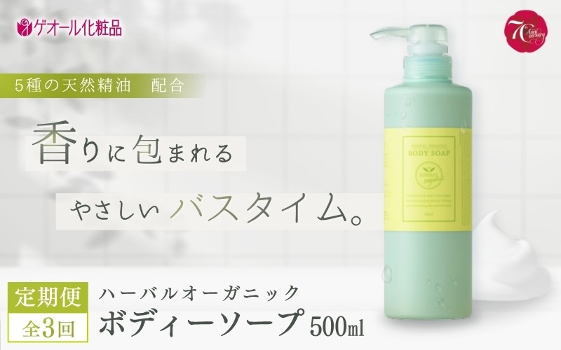 ストックいらず、うれしい毎月発送。 【全3回定期便】ハーバルオーガニック ボディーソープ 500ml ポンプ付1回目 詰め替え/2,3回目 / ゲオール化粧品 バス用品 風呂 奈良県【geol024】
