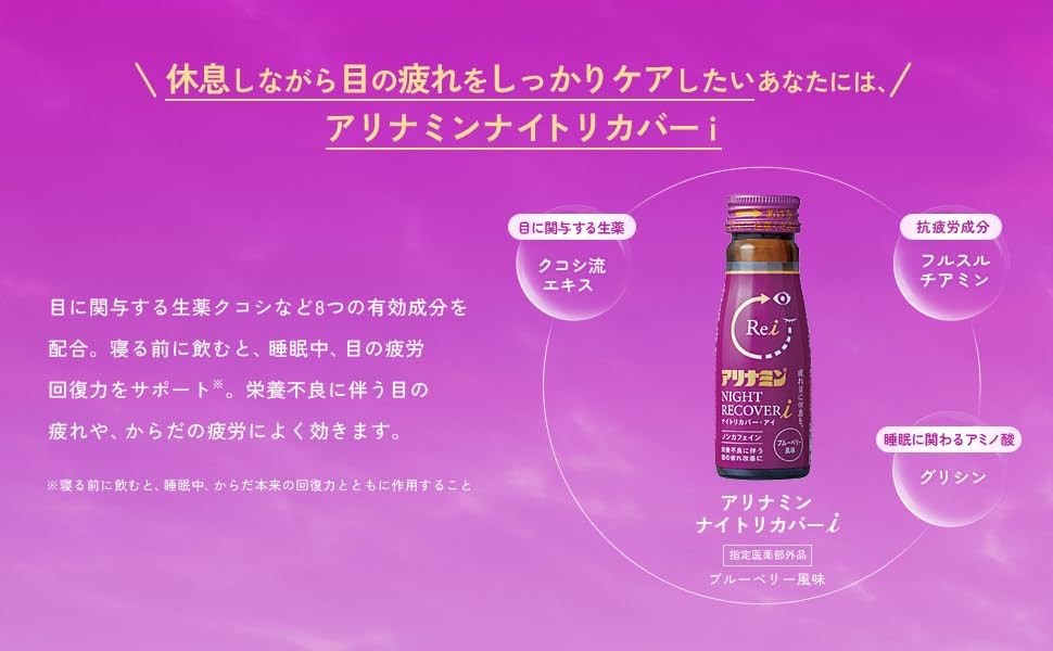しっかり休息して、疲れた目もカラダも回復したい 朝、気持ちよくスタートしたい人に 【定期便】アリナミン ナイトリカバーi 50ml×10本×5パック (1ケース)×7回 / フルスルチアミン グリシン ノンカフェイン 疲労回復 リフレッシュ 睡眠の質 不調 疲れやすい だるい ブルーベリー風味 指定医薬部外品 集中 仕事 勉強 体力低下 食欲不振 栄養補給 病中 病後 奈良県 葛城市【tept-tkb030】