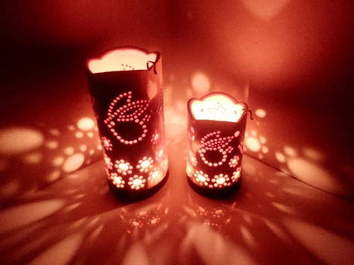 竹製キャンドルホルダー フクロウセットF-1 (表皮焦がしタイ…15,000 円 人と竹との関係は、縄文時代の竹かご、戦国時代の武具•防具、ろうそくの明かりとりの道具、華道茶道の道具、楽器、 建築資材など生活に欠かせないものでありましたが、 現在は竹材の需要が減り放置された竹が増殖し植生を脅かす「竹害」とまで言われるような時代になりました。 竹あかりの材料確保のため竹林に入り伐採整備することは環境保全の一端を担っていることにもなっています。 どこにでもある素材をどこにもない逸品へと再生させます。 おうち時間にご活用ください。 地元の竹を伐採、乾燥・油抜きの工程を経てドリルで穴を開けニス仕上げしています。(黒く見えるのはバーナーで油抜き後、更に竹の表皮を焦がしています) 自然素材からの手作りのため、フクロウのデザイン・大きさ等画像と異なる場合がありますので予めご了承ください。 乾燥や湿気により割れやカビが発生する場合があります(対策としてニス仕上げ済) 竹から漏れる灯りを楽しんでいただく他に、 中に器を入れて一輪挿しやペン立てとしてご使用いただけます。 ローソクはティーライトキャンドル(直径38mm)の平たいものを使用してください。 キャンドルを灯している間はそばを離れず、可燃物の近くで使用しないでください。 提供:竹あかり「輪々」 - 常温便