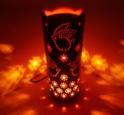 竹製キャンドルホルダー 猫 K-1 (表皮焦がしタイプ) / 天然素…10,000 円 地元の竹を伐採、乾燥・油抜きの工程を経てドリルで穴を開けニス仕上げしています。(黒く見えるのはバーナーで油抜き後、更に竹の表皮を焦がしています) 自然素材からの手作りのため、デザイン・大きさ等画像と異なる場合がありますので予めご了承ください。 竹から漏れる灯りを楽しんでいただく他に、ペン立てや中に器を入れて一輪挿しとしてご使用いただけます。 ローソクはティーライトキャンドル(直径38mm)の平たいものを使用してください。 キャンドルを灯している間はそばを離れず、可燃物の近くで使用しないでください。在庫がない場合は制作に2か月以上かかります。また一時的に申し込みが集中した場合はさらに日数がかかります。 ≪使用例:誕生日やクリスマスの演出に アロマキャンドルを入れてリラクゼーションサロンにて 飲食店の空間演出に 虫よけキャンドルを入れてキャンプに≫ 人と竹との関係は、縄文時代の竹かご、戦国時代の武具・防具、ろうそくの明かりとりの道具、華道茶道の道具、楽器、建築資材など生活に欠かせないものでありましたが、現在は竹材の需要が減り放置された竹が増殖し植生を脅かす「竹害」とまで言われるような時代になりました。 竹あかりの材料確保のため竹林に入り伐採整備することは環境保全の一端を担っていることにもなっています。 ≪どこにでもある素材をどこにもない逸品へと再生≫ おうち時間の癒しにご活用ください。 【原材料】 孟宗竹 提供:竹あかり「輪々」 - 常温便