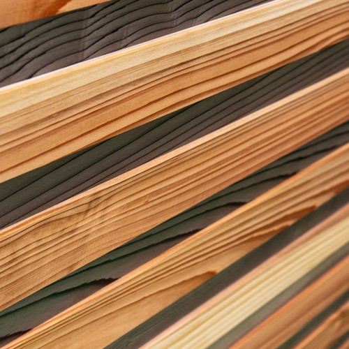 本物の木の木目があり、厚みの違う木を交互に張り合わすことで、立体感のある壁面となります。