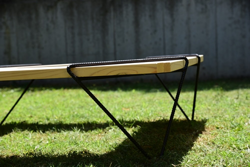 キャンプ場に到着して最初に設置したいアイテム。アイアン素材の脚部に天板を差し込むだけで設置できる優れもの。天板は4枚で1組。組立時間は数秒でストレスを感じさせない。焚火台を囲むスクエアテーブル。