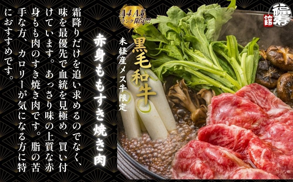 福寿館特製わりした付き!!万能な赤身もも肉!!! <選べる容量> 黒毛和牛めす牛 赤身もも すき焼き肉 500g・800g 自家製わりした付き /すき焼き ふるさと納税 黒毛和牛 肉 牛肉 お中元 お歳暮 正月 ギフト 和牛 食べ物 奈良県 宇陀市 福寿館