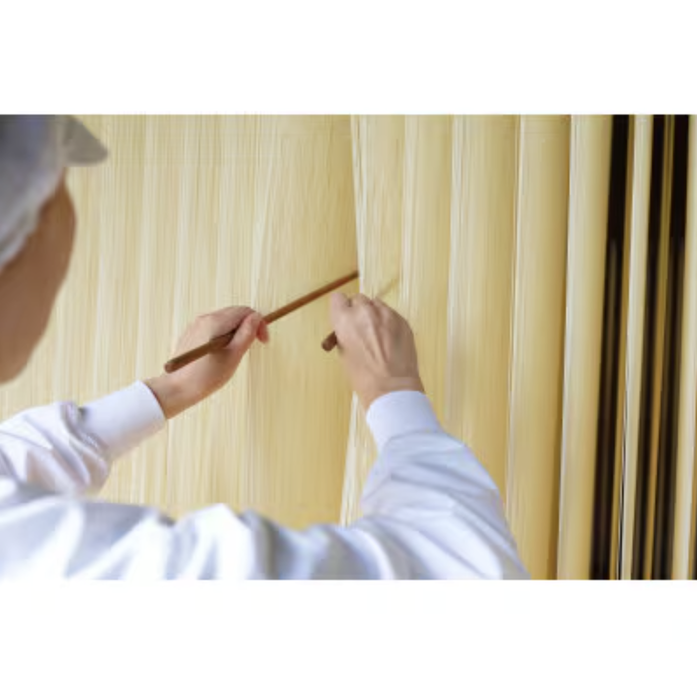 塩水を作り捏ねる。麺圧機で圧力をかけ生地を整えてから太い紐状に切り分ける。ロール機を通しながら細くし掛け巻き作業に入る。小引作業、さばき作業、乾燥を経て裁断、結束、箱詰めで完成となります。