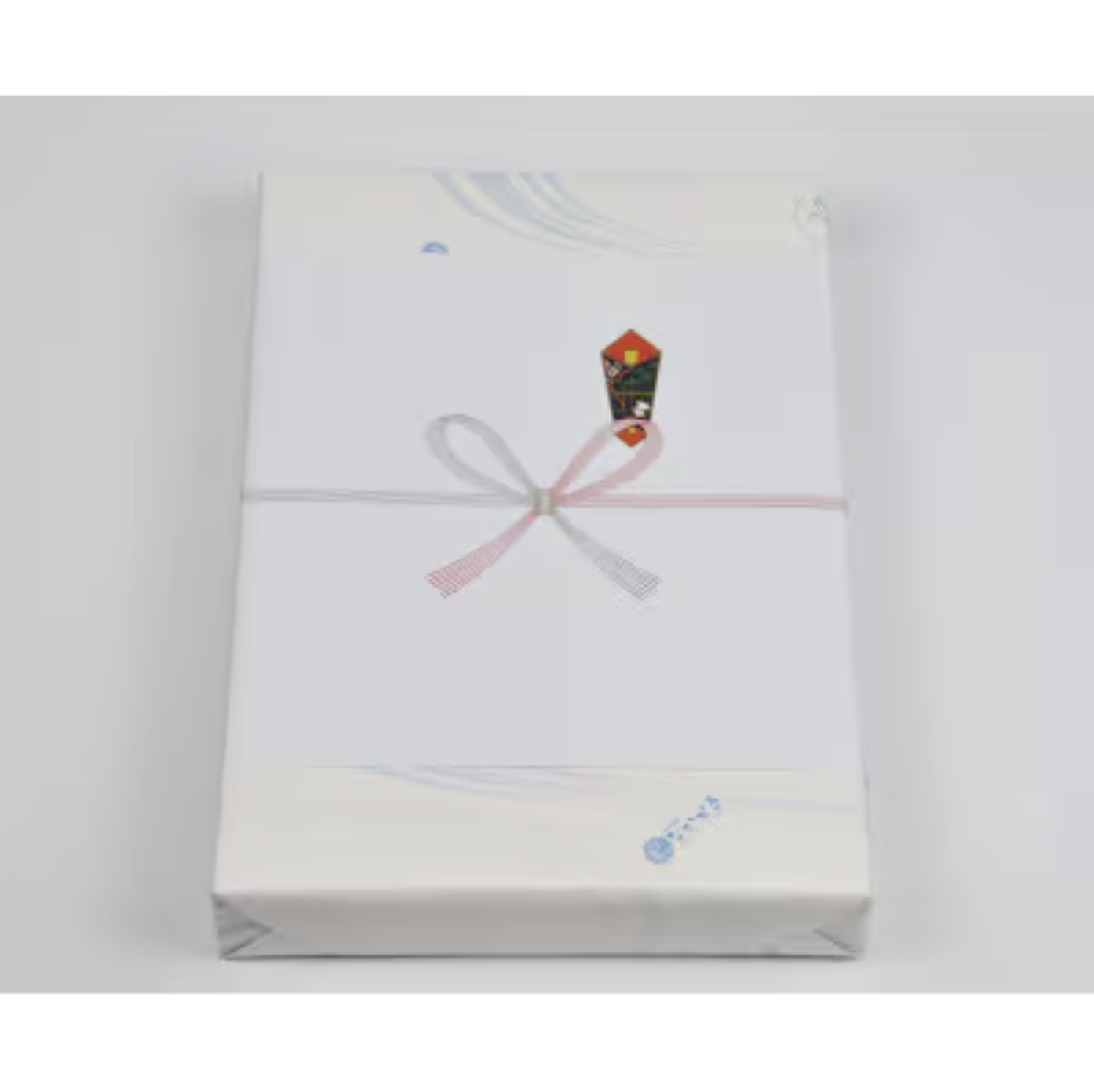 鳥居の金帯で結束した素麺を、一束一束、巻き紙で巻いています。