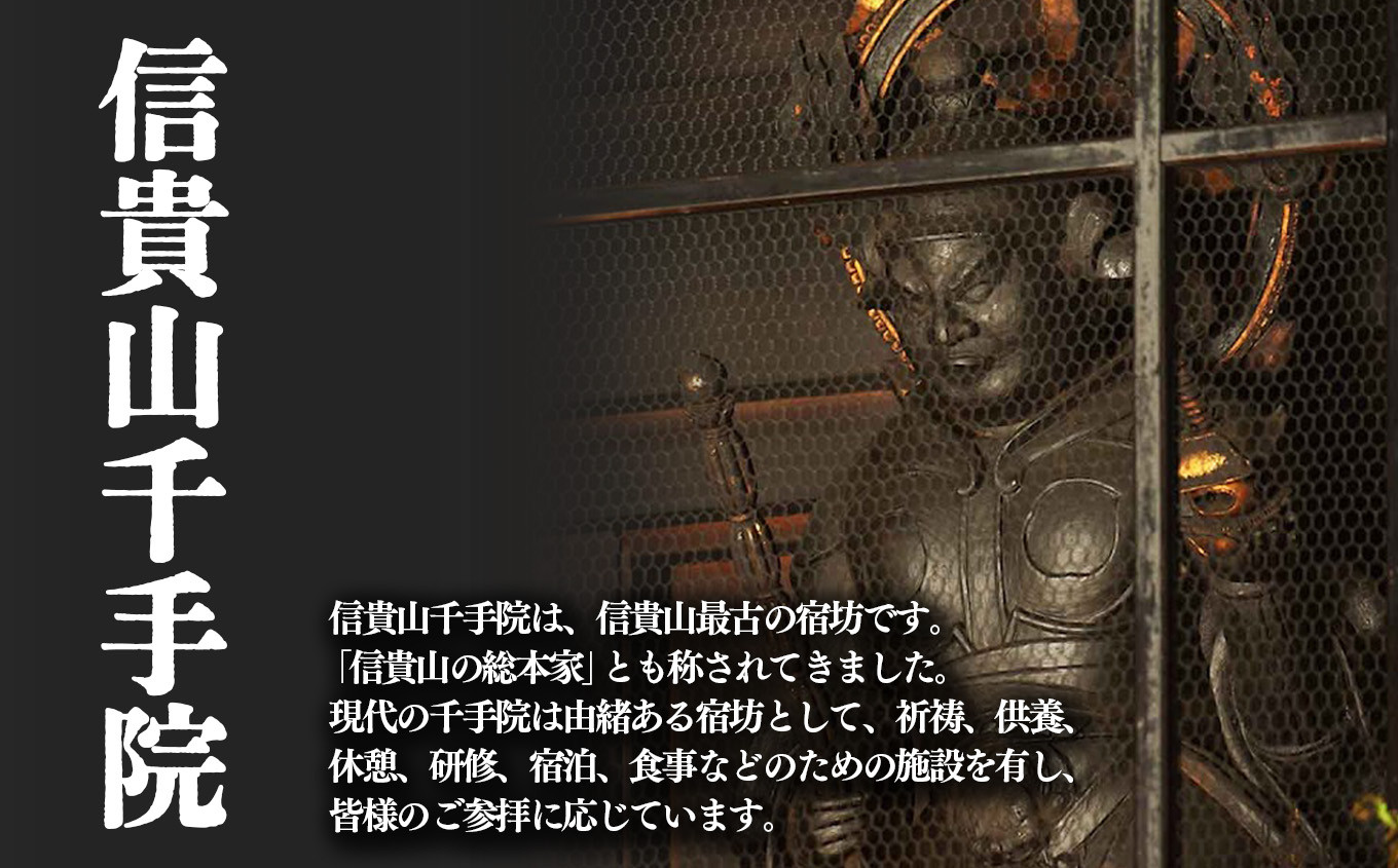信貴山千手院は大般若祈祷と毘沙門護摩を修し、毘沙門天王への様々なお願いごとをお祈りする根本道場であり、参拝者が泊まれる信貴山内最古の宿坊です。