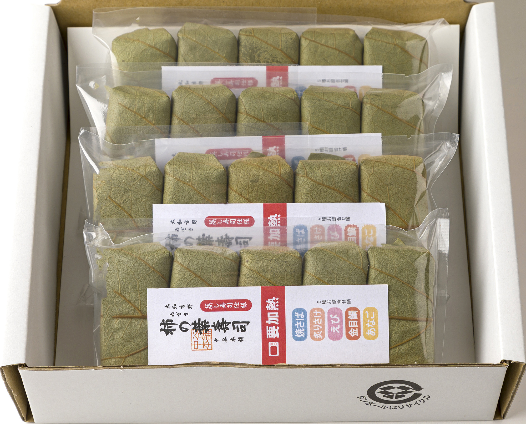 | 容量 | 柿の葉寿司(えび、あなご、金目鯛、炙りさけ、焼さば)各4個 【箱サイズ】約23.0×21.0×6.0cm |